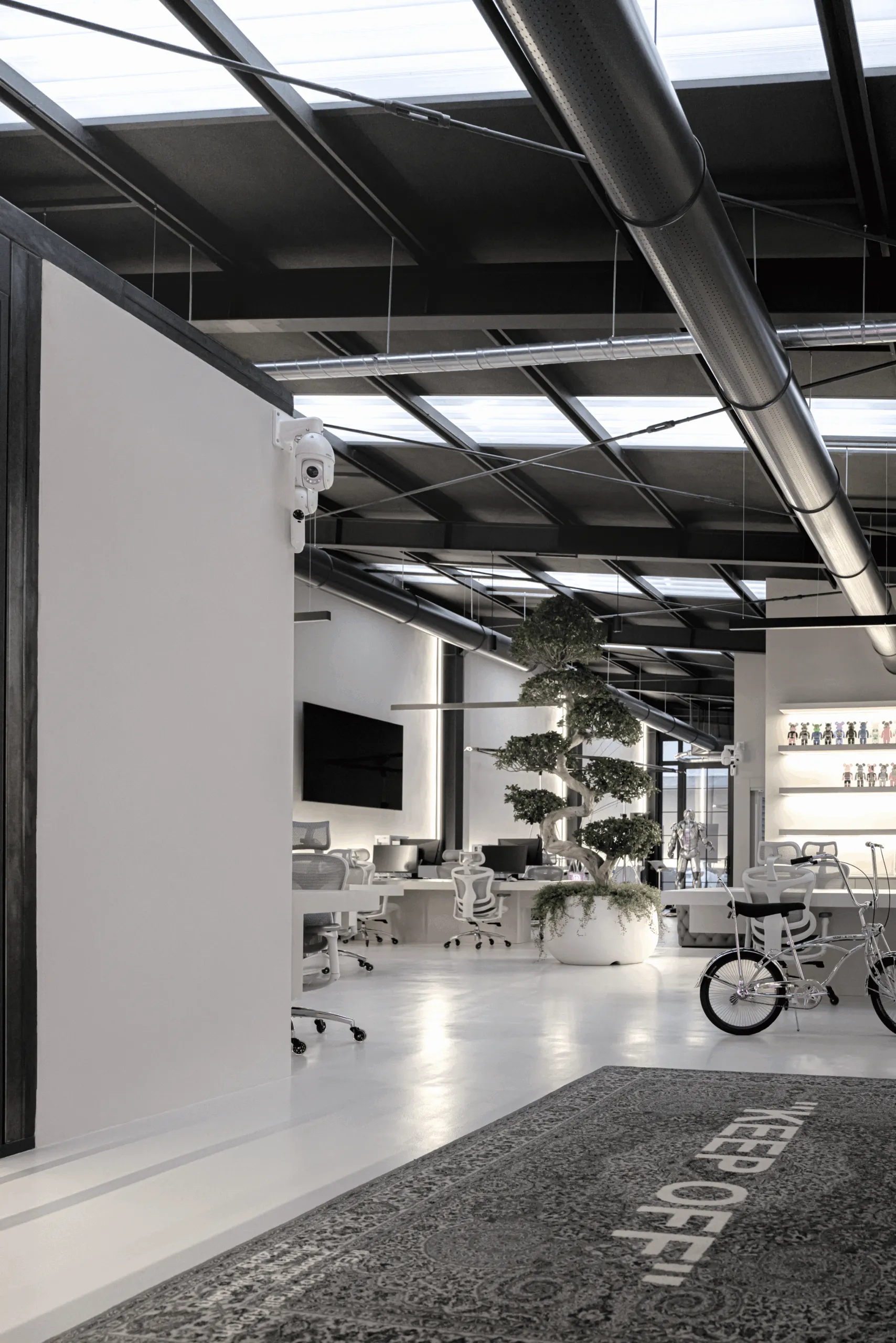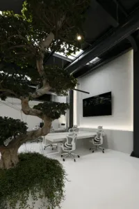 L’interior design combina cemento, palette grigie e volumi puri, creando un equilibrio tra solidità e leggerezza. Al centro della sala principale, un bonsai di quattro metri diventa simbolo di crescita e vitalità, mentre i grandi tavoli operativi da quattro metri definiscono la natura condivisa e collaborativa del lavoro.